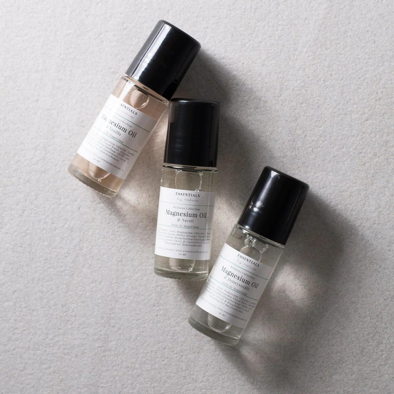 Essentials by Nature: Experience the ultimate self-care package with the Magnesium Roller Kit, featuring four full-sized rollers in our most loved blends: Peppermint, Lavender, Rose, and Vanilla.