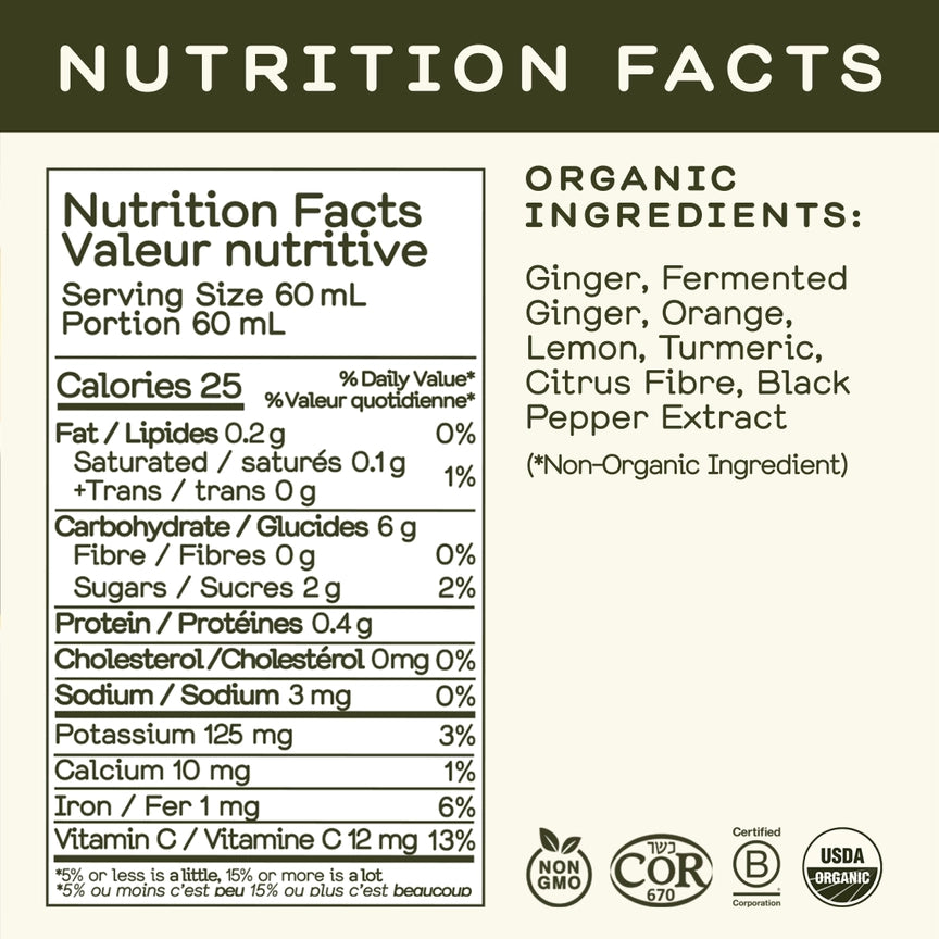 Ingredients: Organic Ginger, Organic Fermented Ginger, Organic Orange, Organic Lemon, Organic Turmeric, Citrus Fibre, Black Pepper Extract, Oregano Extract