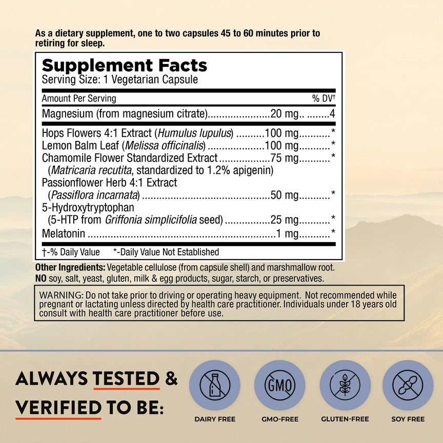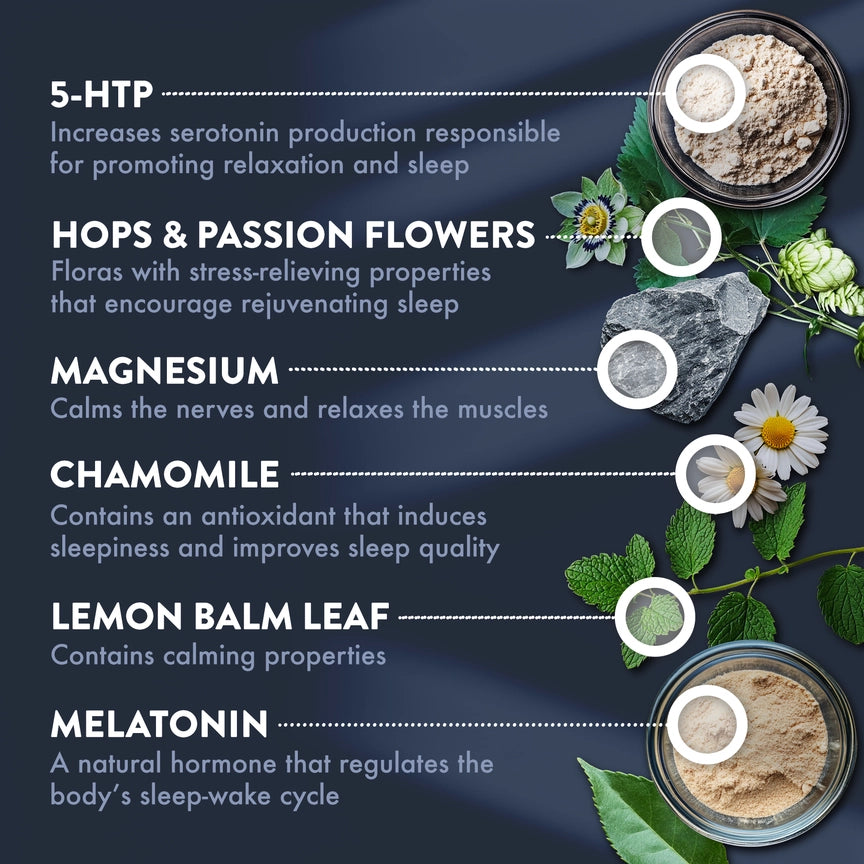 Magnesium, passion flowers, 5-HTP relax your mind and body for bedtime, and Melatonin, Hop extract, Lemon Balm, Chamomile rejuvenate a healthy sleep-wake cycle.